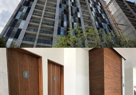 De Marriot Puertas de acceso a habitación, baños, áreas comunes, roperías, entre otras. En madera acabado en Nogal, salidas de emergencia certificadas 180 minutos en metal.